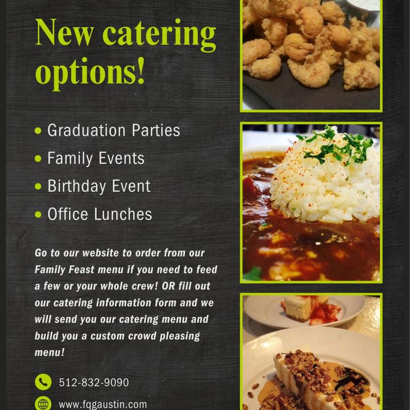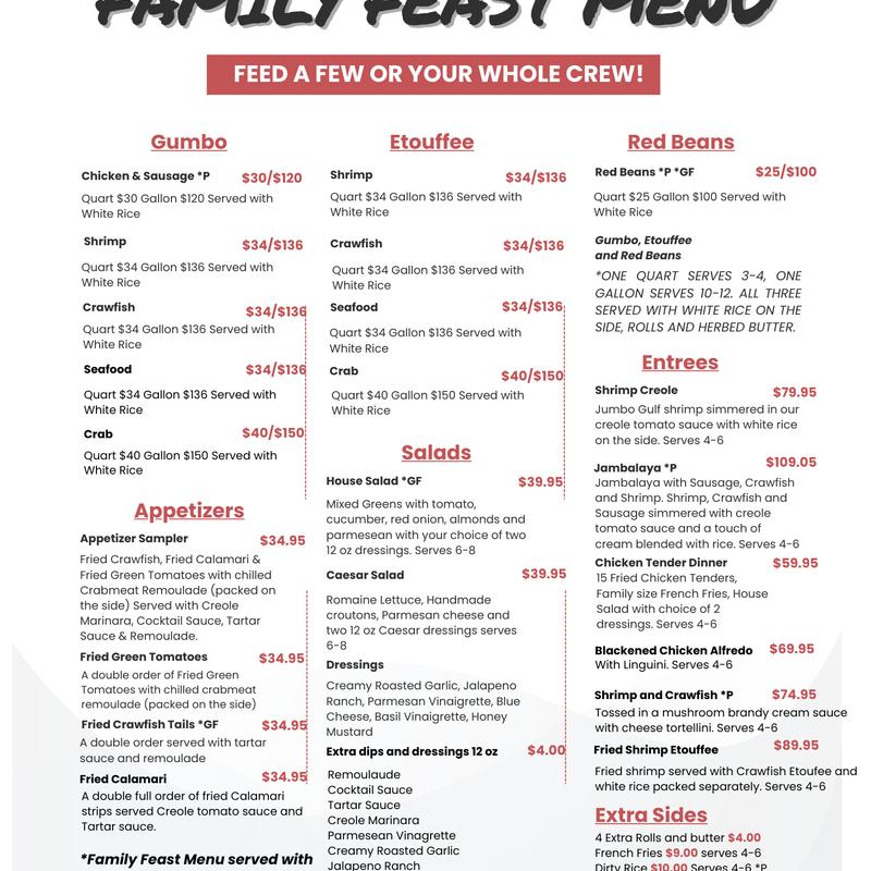 Good food is an essential part of any event - let us do the catering and make it one to remember. Family packs and catering menus available! Eat, Drink and be Cajun!